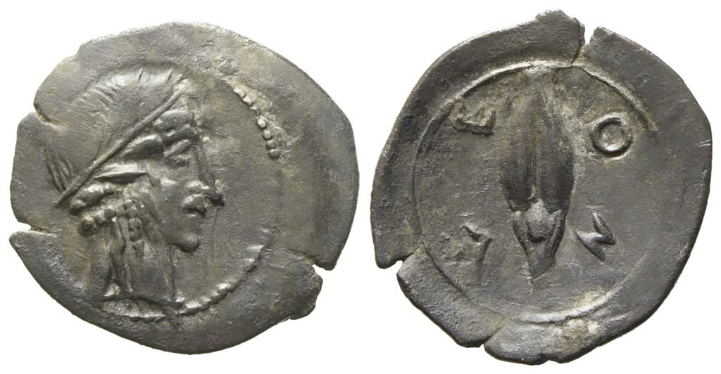 Laureate head of Apollo r.; border of dots; Rv. ΛΕ – ΟΝ, upright grain of barley. Boehringer 43; Buceti 27; SNG ANS 263. Good very fine / near extremely fine.