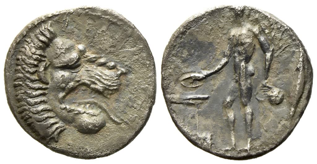 Head of roaring lion to right; LEON above; Rv. Apollo standing to left, pouring libation over altar from patera, and cradling olive branch; barley grain to right. Boehringer 49-50; HGC 2, 692; Buceti 42; SNG ANS 264. Very rare. Extremely fine. Slight porosity.