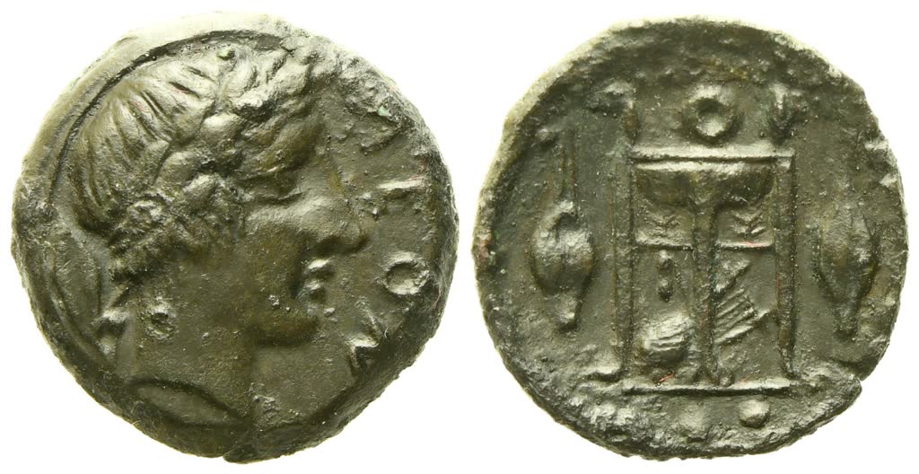 ΛΕΟΝ, laureate head of Apollo r., behind, laurel leaf with berry; Rv. Tripod between two grains of corn; between legs, chelys; in exergue, three pellets (mark of value). SNG ANS 270; Calciati III, 77, 3. Dark patina. Good extremely fine / FDC.