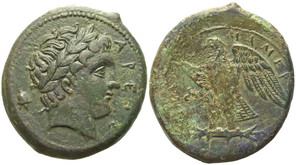 Laureate head of Ares r.; helmet to l.; Rv. ΜΑΜΕΡ-ΤΙΝΩΝ, eagle standing l. on thunderbolt, wings spread; Φ to l. CNS I, 4; SNG ANS 403; HGC 2, 865. Lovely green patina. About extremely fine / very fine.