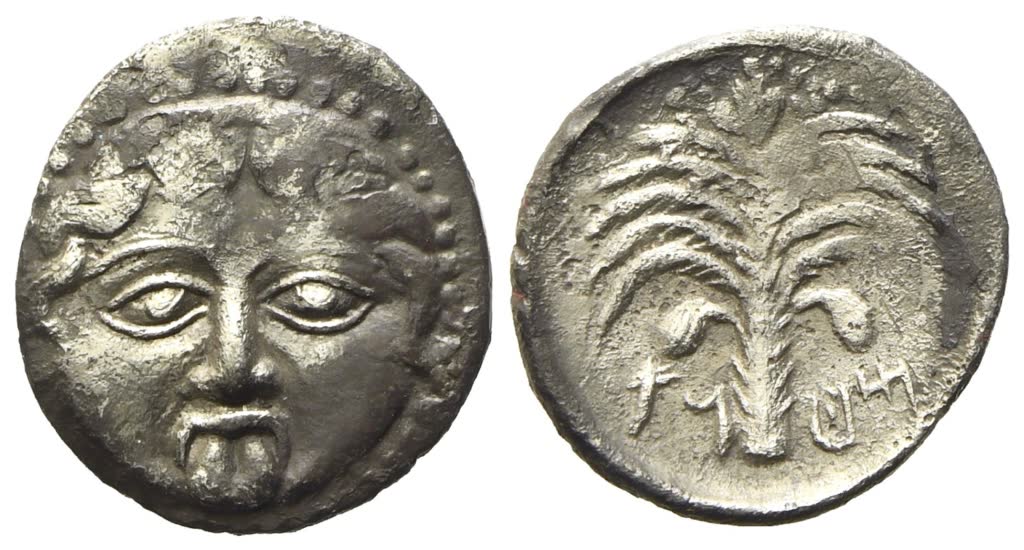 Facing gorgoneion; Rv. Palm tree; Punic legend across field. Jenkins 4a; Campana 15a; SNG ANS 503-505; SNG Copenhagen 483-484. Good very fine / near extremely fine.