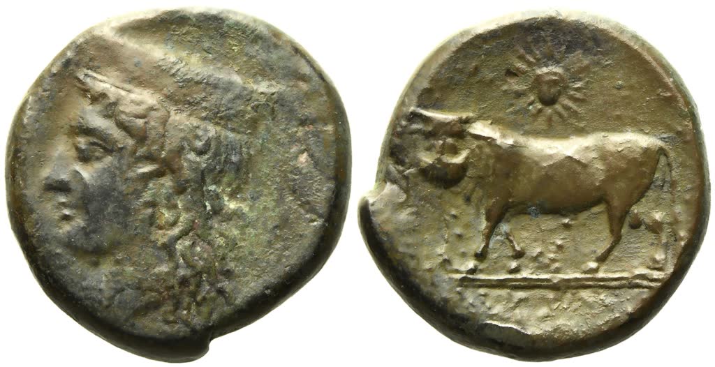 Head of Hera l., wearing polos; Rv. Man-headed bull standing l.; radiate head of Helios above. Calciati I 270, 5. SNG ANS 554. Brown tone with green shades. Very fine.