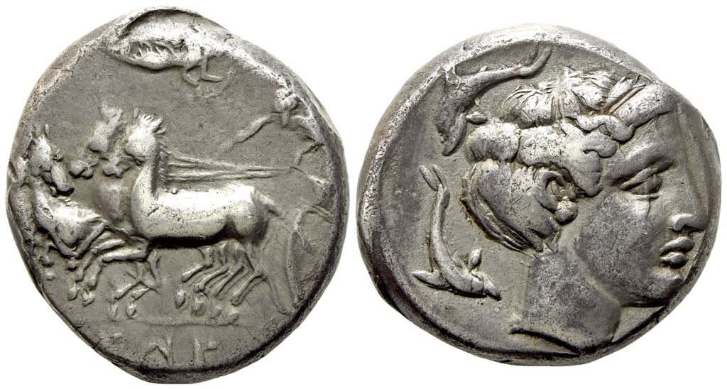 𐤑𐤉𐤑 ('ṣyṣ' in Punic), charioteer driving quadriga galloping to left, holding kentron in his right hand and reins in his left; above, Nike flying r., crowning the charioteer with a wreath; Rv. Female head to right, wearing ampyx; around, four dolphins. HGC 2, 1004. Jenkins, Punic, 12 (O3/R11). Good very fine.