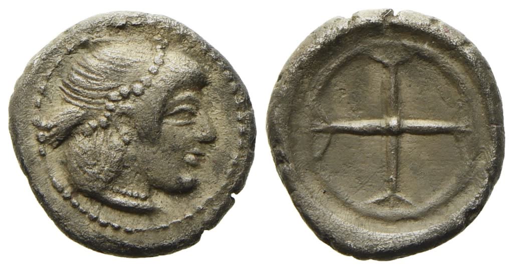 Head of Arethusa to r., wearing pearl tainia, single pendant earring and necklace; Rv. Wheel with four spokes. Boehringer Series XI, 279-85 or Series XII, 362-70; SNG ANS 116-8; HGC 2, 1371. Dark patina. Good extremely fine.