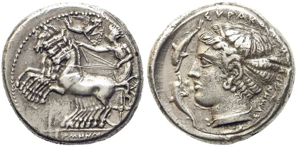 Dies signed by Eumenes. Struck circa 415-409 BC. Charioteer driving fast quadriga l.; above, Nike flying r., crowning charioteer; [E]VMHNOV in exergue; Rv. Head of Arethousa l., hair in band; EVMHN-OV behind neck, four dolphins swimming around. Fischer-Bossert, Coins 23 (V9/R16); Tudeer 23; HGC 2, 1328; SNG ANS 258 = Bement 494; SNG Lloyd 1367; SNG Lockett 961; BMC 144; Boston MFA 400 = Warren 370; Dewing 841; Gillet 611; Jameson 792. Some porosity, otherwise about extremely fine.
