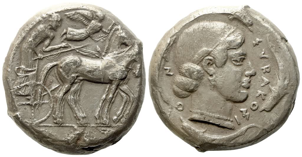 Struck 450-440 BC c.ca. Charioteer, holding kentron and reins, driving slow quadriga r.; above, Nike flying right, crowning horses with wreath; in exergue, ketos r.; Rv. ΣYRAKOΣI-O-N, diademed head of Arethusa right, wearing single-pendant earring and necklace, hair bound with single thin diadem and rolled in the back; four dolphins around. Boehringer 504 (O267/R360); HGC 1311. Good very fine / near extremely fine.