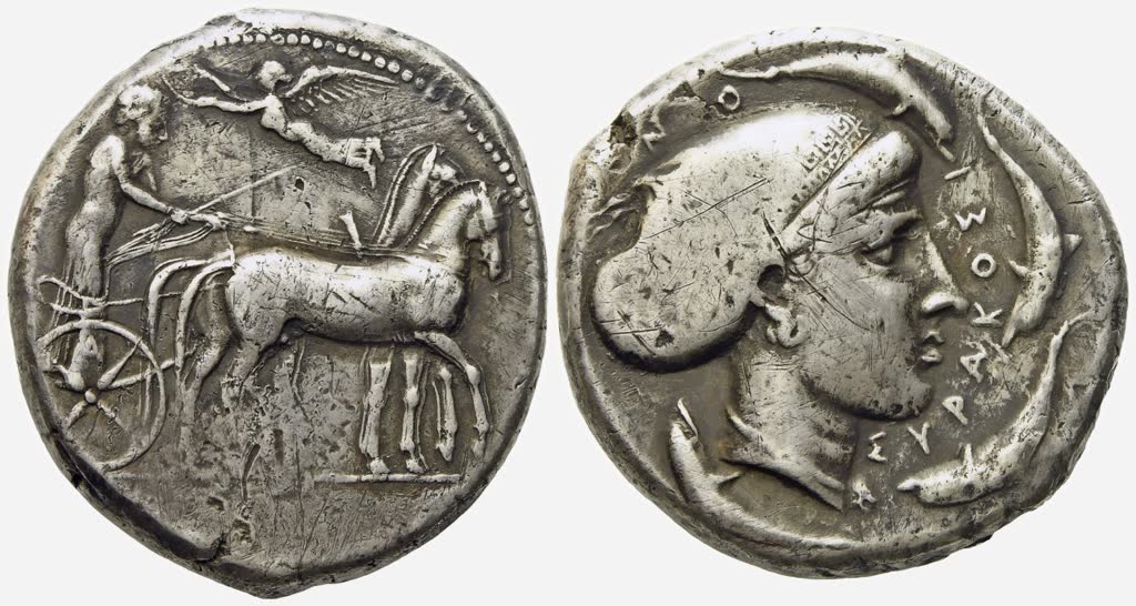 Struck c.ca 420. Quadriga walking to r.; above, Nike flying l. to crown the charioteer; Rv. Diademed head of Arethusa to r., her hair bound in a sakkos ornamented with a maeander pattern; around, four dolphins swimming to r. Boehringer 709. Very fine / good very fine. Fine style.