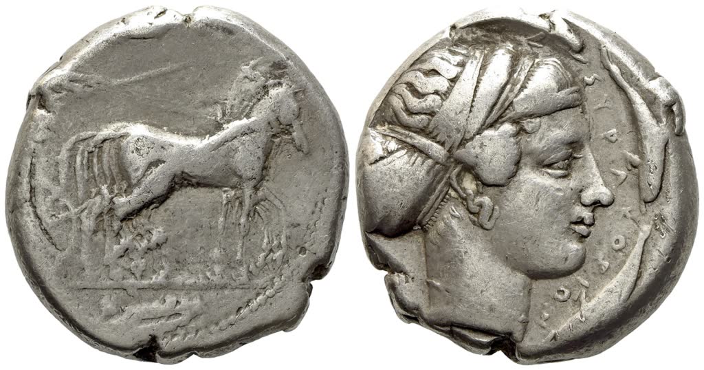 Struck circa 420-415 BC. Charioteer driving quadriga r.; above, Nike flying l., crowning charioteer; Rv. ΣΥΡΑΚΟΣΙΩΝ, head of Arethusa r., hair in wide band; four dolphins around. Boehringer 722; HGC 2, 1323. Some weakness of strike on the obverse, otherwise good very fine / very fine. Fine style.