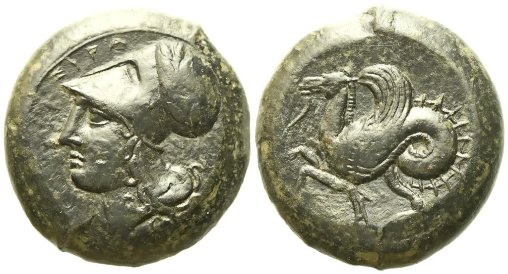 ΣΥΡΑ, Head of Athena left, wearing Corinthian helmet with neck guard, Rv. Hippocamp left. Holloway, Further, Series 4, fig. 9; CNS 34; HGC 2, 1456. Dark green patina. Extremely fine.