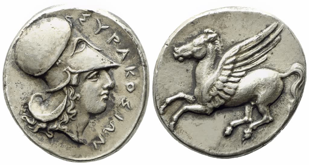 Pegasos flying l.; Rv. ΣΥΡΑΚΟΣΙΩΝ, helmeted head of Athena r. Pegasi 2; SNG ANS 494–507; SNG Lloyd 1442-3; HGC 2, 1400. Traces of old cleaning. Fields gently smoothed. Possible minor tooling following cleaning. Good extremely fine. Fine style.