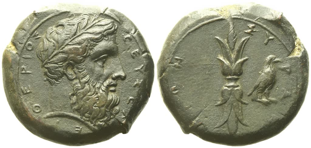 ΖΕΥΣ ΕΛ-ΕΥ-ΘΕΡΙΟΣ, laureate head of Zeus Eleutherios r.; Rv. ΣΥΡΑΚΟ-ΣΙΩΝ, winged thunderbolt; on r., eagle standing r. CNS 72; HGC 1440. Expressive portrait. Dark tone. Good extremely fine.