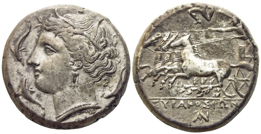 Circa 317-310. Head of Arethusa to left, wearing wreath of grain leaves, triple pendant earring and pearl necklace; around, three dolphins; below neck, ΦΙ. Rev. ΣYPAKOΣIΩN Charioteer driving quadriga galloping to left, holding kentron in his right hand and reins in his left; above, triskeles running left; in exergue, monogram of AI. SNG ANS 642. Refined style. Near extremely fine / extremely fine.