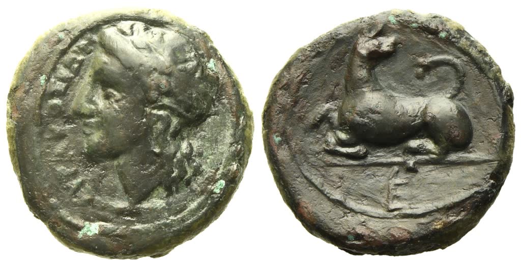 ΣYPAKOΣΙΩN, head of Apollo l.; Rv. Dog lying l., head r. towards a snake; monogram in exergue. SNG ANS 745; Calciati, 149R1/7. Dark brown-green patina. Extremely fine.
