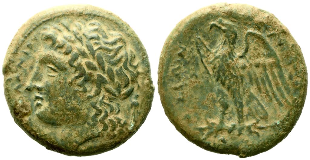 ΔΙΟΣ ΕΛΛΑΝΙΟΥ, laureate head of Zeus Hellanios to l.; Rv. ΣΥΡΑΚΟΣΙΩΝ, eagle standing to l. on thunderbolt. CNS 154; SNG ANS 819-25; HGC 2, 1448. Green patina with brownish hues. Good very fine / near extremely fine.