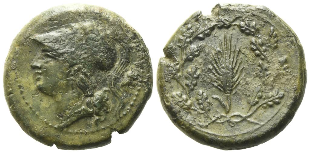 Head of Athena l., wearing crested Corinthian helmet ornamented with a griffin; behind, owl standing r., head facing; Rv. Grain ear within oak wreath. CNS II p. 334, 188; Virzi 1829. Olive green patina. Small edge splits, otherwise good very fine / near extremely fine.