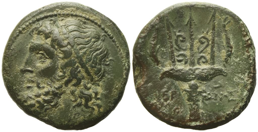 Diademed head of Poseidon l.; Rv. Ornamented trident head flanked by two dolphins; across fields, IEP - ΩNOΣ. HGC 2 1550; CNS II 197; SNG ANS 965. Pleasing green patina. Good very fine / near extremely fine.