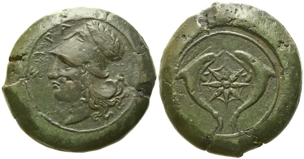 Head of Athena l. wearing Corinthian helmet bound with olive wreath; Rv. Eight-pointed starfish between two facing dolphins. Calciati, II, p.111-129; Sear 1189. Dark green patina. Good very fine.