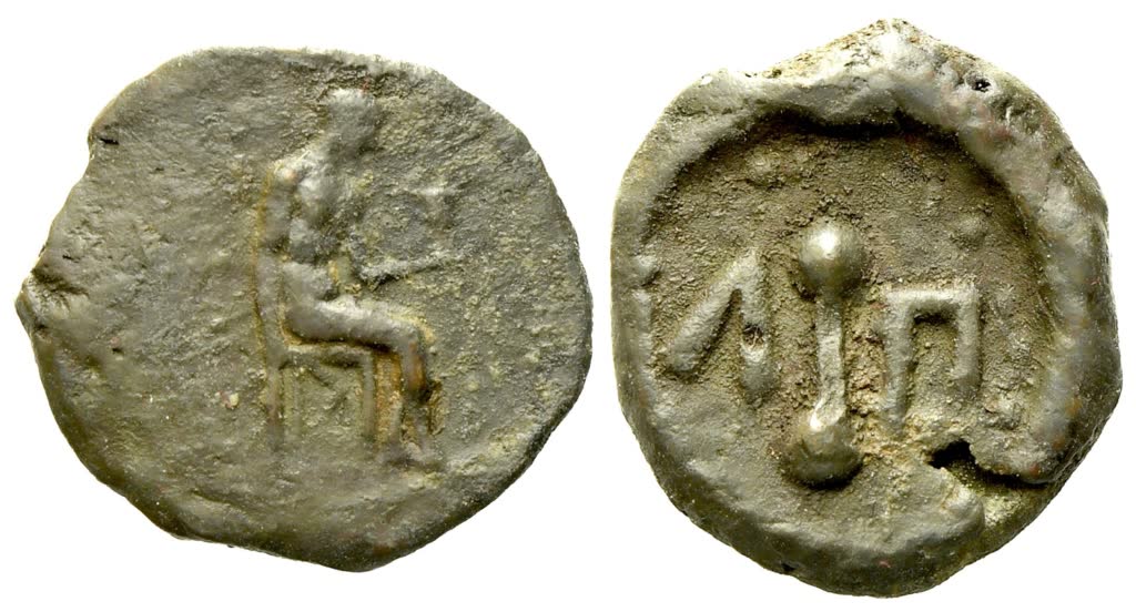 Hephaistos seated r., holding hammer and kantharos; Rv. ΛΙΠ between two pellets. CNS I, 22; HGC 2, 1772. Dark patina. Good very fine.