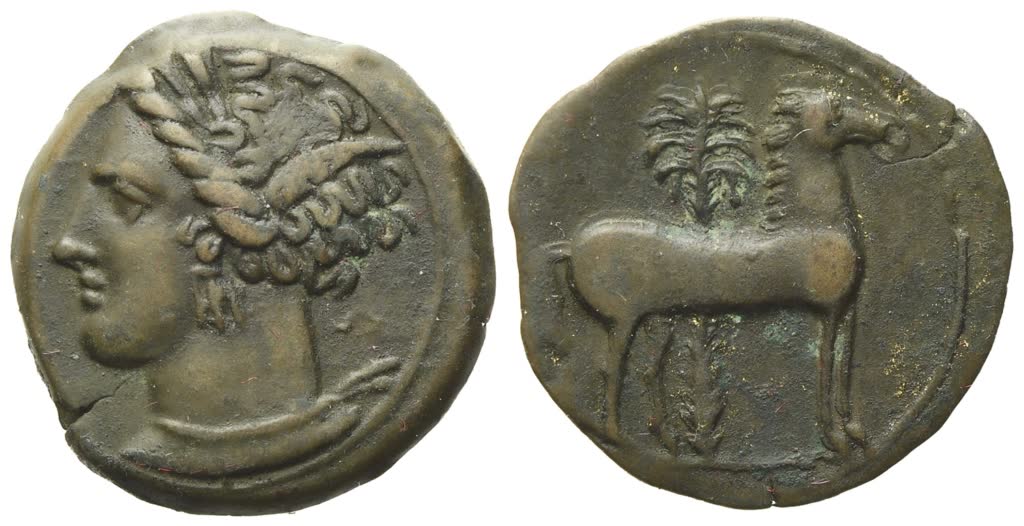 Wreathed head of Tanit l., wearing earring and necklace; Rv. Horse standing r. before palm tree. SNG Copenhagen 109-113. Brown patina. Extremely fine.