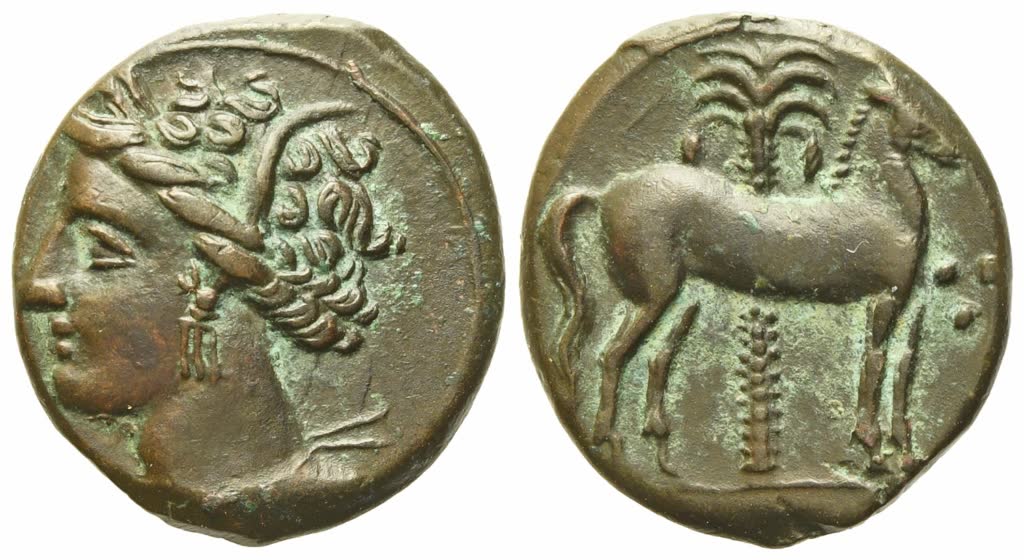 Wreathed head of Tanit to l.; Rv. Horse standing to r. before palm tree; three pellets before. MAA 18f; cf. SNG Copenhagen 117-9. Lovely chocolate brown patina with light green highlights. Good extremely fine.