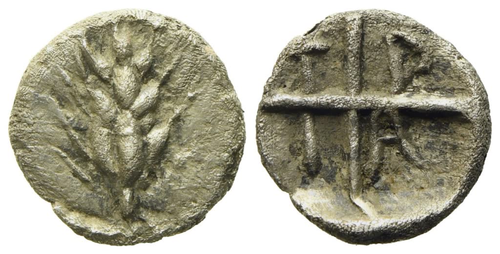 Grain ear; Rv. Quadripartite incuse square with T-P-A-I in quadrants. AMNG III 2; SNG ANS 903; HGC 3, 745. Good very fine.