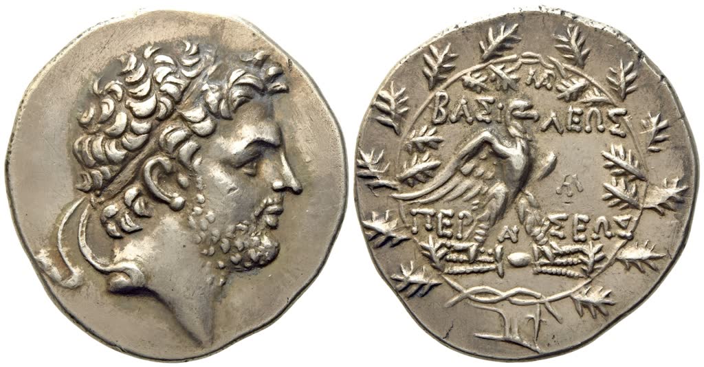 Diademed head of Perseus right, with close beard, Rv. ΒΑΣΙ-ΛΕΩΣ ΠΕP-ΣΕΩΣ, eagle with spread wings standing right on thunderbolt; MAP monogram above, AY (mintmaster) monogram in right field, AN monogram between legs; all within oak wreath, plow right below. Mamroth, Perseus 25. HGC 3, 1094. Near extremely fine.
