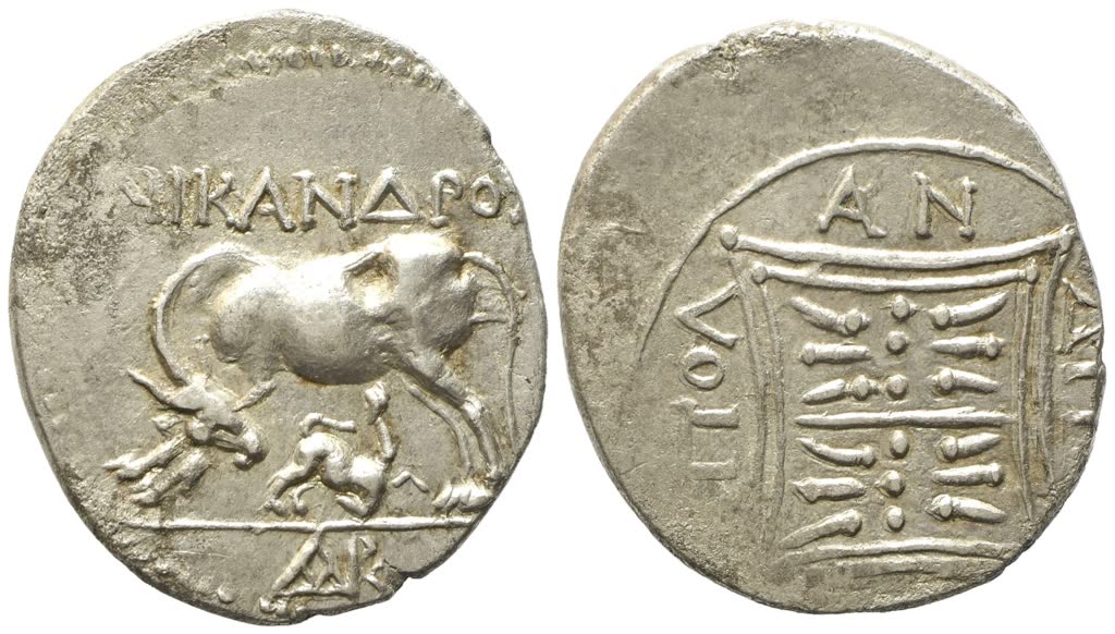 Andriskos and Nikandros, magistrates. ΝΙΚΑΝΔΡΟΣ, magistrate's name above cow standing l., looking back at suckling calf, monogram below; Rv. AΠOΛ ΑΝ-ΔΡΙΣ-ΚΟΥ, legend in four segments around double-lined quadrilateral containing stellate pattern. Cf. A. Maier, Die Silberprägung von Apollonia und Dyrrhachion 13. Slightly off-centre, otherwise good very fine.