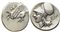 Pegasos flying left, Rv. ΘΥΡΡ, head of Athena to left, wearing Corinthian helmet; behind neck guard, rhyton ending in forepart of a griffin. BCD Akarnania 367. Calciati 2. Rare. Near extremely fine.