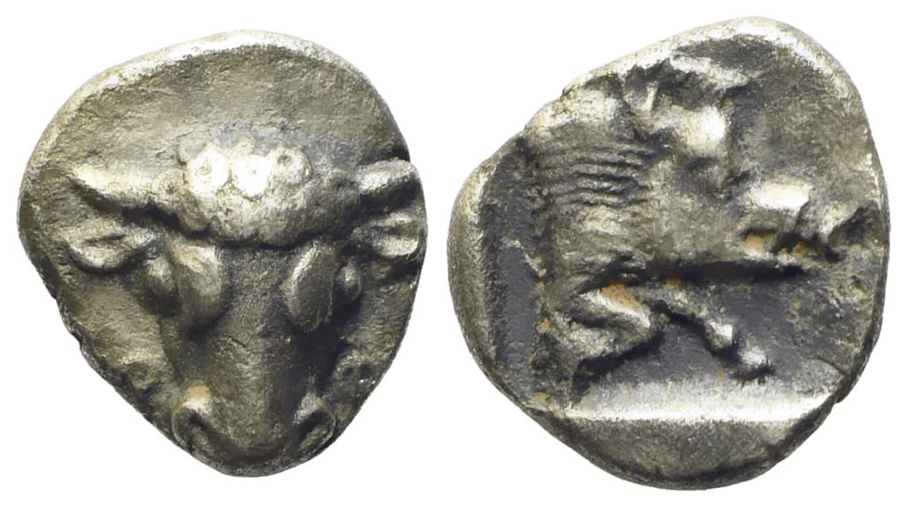 Frontal bull’s head, the hair shown in ringlets, O to l., Φ to r.; Rv. Boar forepart to r. in incuse square showing both legs. Williams 226 (O.159 / R.132). Good very fine / about extremely fine.