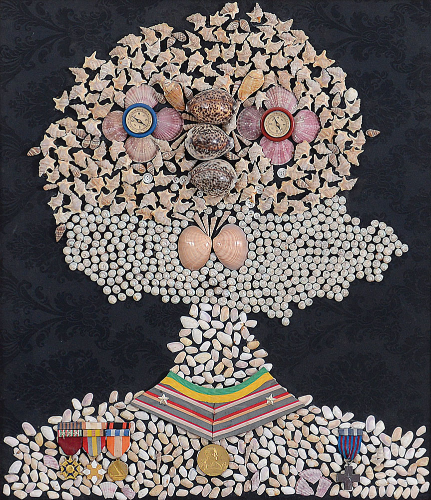 conchiglie e medaglie su legno cm. 80x70, esemplare 61/80 titolo, firma e numerazione al retro.