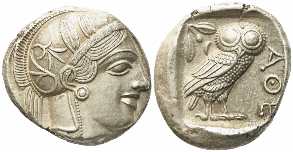Helmeted head of Athena r.; Rv. Owl standing r., head facing; olive spring behind; all within incuse square. Kroll 8; SNG Copenhagen 31. Possible tooling following cleaning intervention, otherwise good extremely fine.