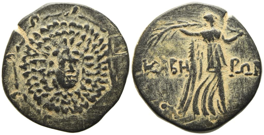 Three-quarter facing head of gorgoneion, head turned slightly r., on an aegis; Rv. ΚΑΒΗ-ΡΩΝ, Nike walking r., holding palm. SNG BM Black Sea 1243. Appealing sandy patina. Good very fine.