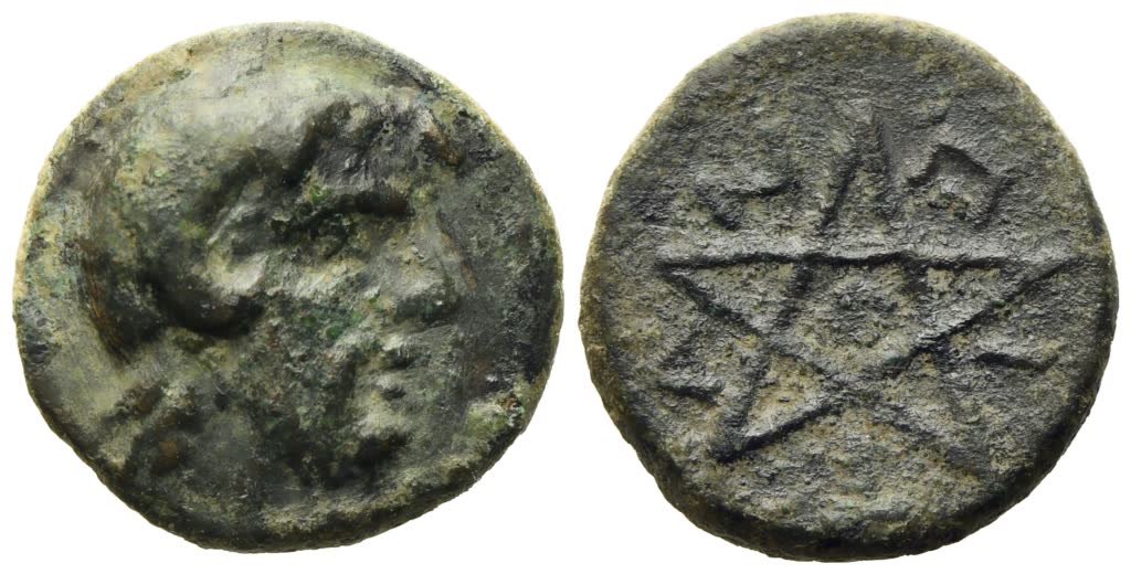 Head of Zeus to r., wearing horn of Ammon; Rv. ΠΙΤΑΝ between the points of a pentagram with pellet in centre. BMC 4-6. Dark green patina. Very fine.