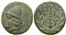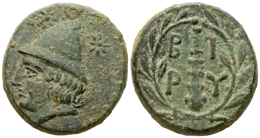 Head of Kabeiros left, wearing pileus; star on either side of pileus; Rv. B-I/R-Y, club downward within wreath. SNG von Aulock 1502-3; SNG München 168. Green patina. Extremely fine. Untouched.