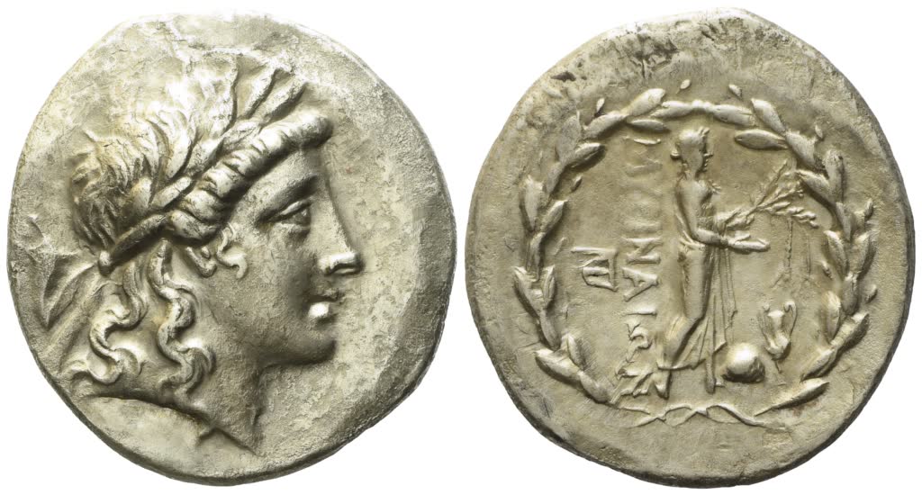Laureate head of Apollo to right. Rev. MΥΡINAIΩN Apollo Grynios standing to right, holding laurel branch in his left hand and phiale in his right; omphalos and amphora at his feet; in left field, monogram of ΠЄ. Sacks Issue 46. SNG Stockholm 209. About extremely fine.