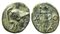 Helmeted head of Athena to r.; Helmeted soldier standing to r., holding shield and preparing to throw spear; Α-Θ over T-A in fields. SNG München 609; SNG von Aulock 1674. Green patina with lighter hues. Very fine.