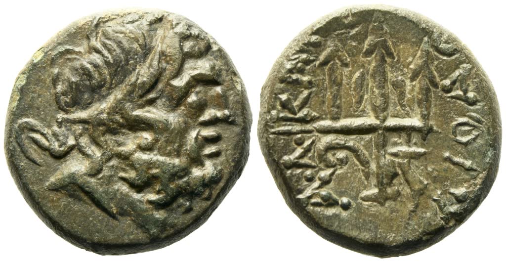 Head of Poseidon r., wearing tainia; Rv.Trident with dolphins between points; cornucopia to lower r. SNG Copenhagen 354 ff. Good very fine.