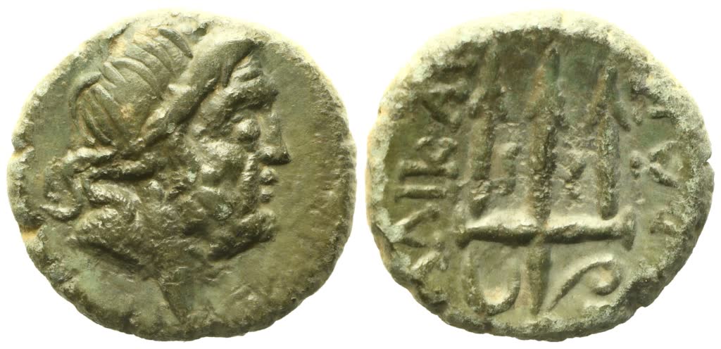 Bearded head of Poseidon r.; Rv. AΛIKA[Ρ] – ΔAM, decorated trident, crescent to l., fish-hook r. Klein 518; SNG von Aulock 8079. Very fine.