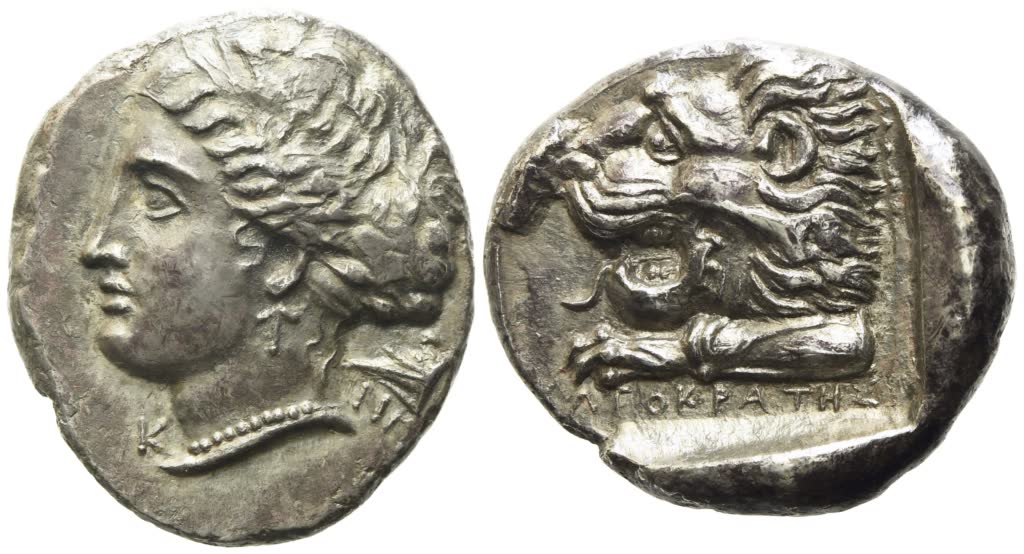 Kleokrates, magistrate. Head of Aphrodite l., hair in ampyx and sphendone; K before neck; behind neck, prow l.; below, N; Rv. ΚΛΕΟΚΡΑΤΗΣ, Forepart of lion l. within incuse square. Hecatomnus 4b (A4/P3). Good extremely fine. Extremely rare, one of the few specimens known with this magistrate.