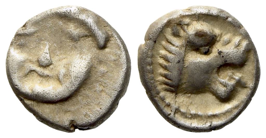 Facing gorgoneion, tongue protruding; Rv. Head of lion r.; all within pelleted linear border. SNG France 42. Very fine.
