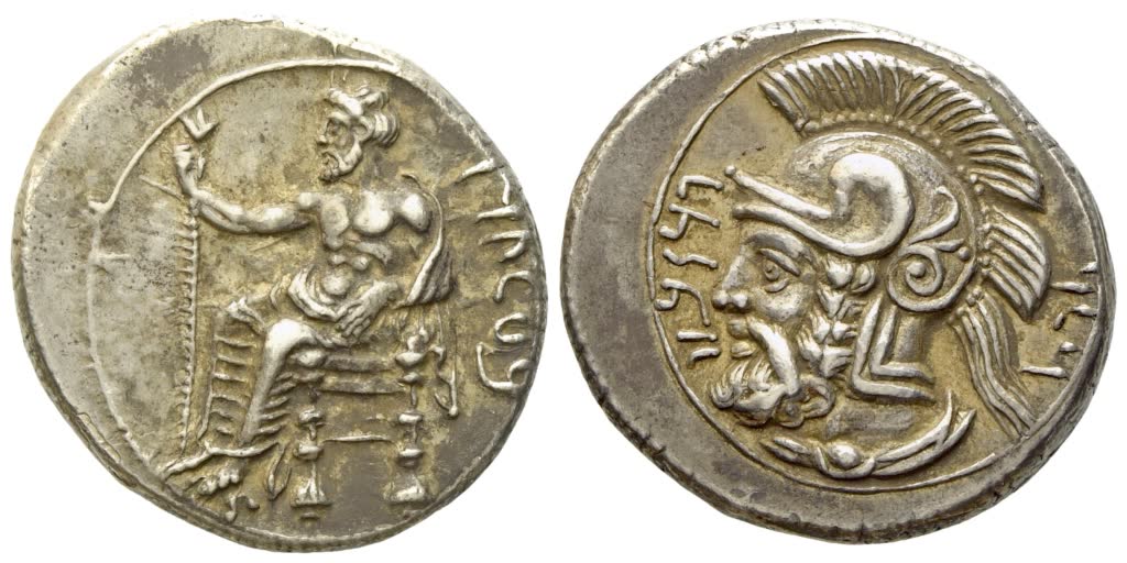 Struck 379-374 BC. 'BLTRZ' in Aramaic r., Baaltars seated l., holding lotus-tipped sceptre in right hand; Rv. 'FRNBZW' in Aramaic l., 'HLK' in Aramaic r., bearded and helmeted male head (Ares?) l. SNG Levante 72; SNG France 251; BMC Lycaonia pg. 165, 21; SNG Copenhagen Supp. 609; SNG von Aulock 5927. Extremely fine / good extremely fine.