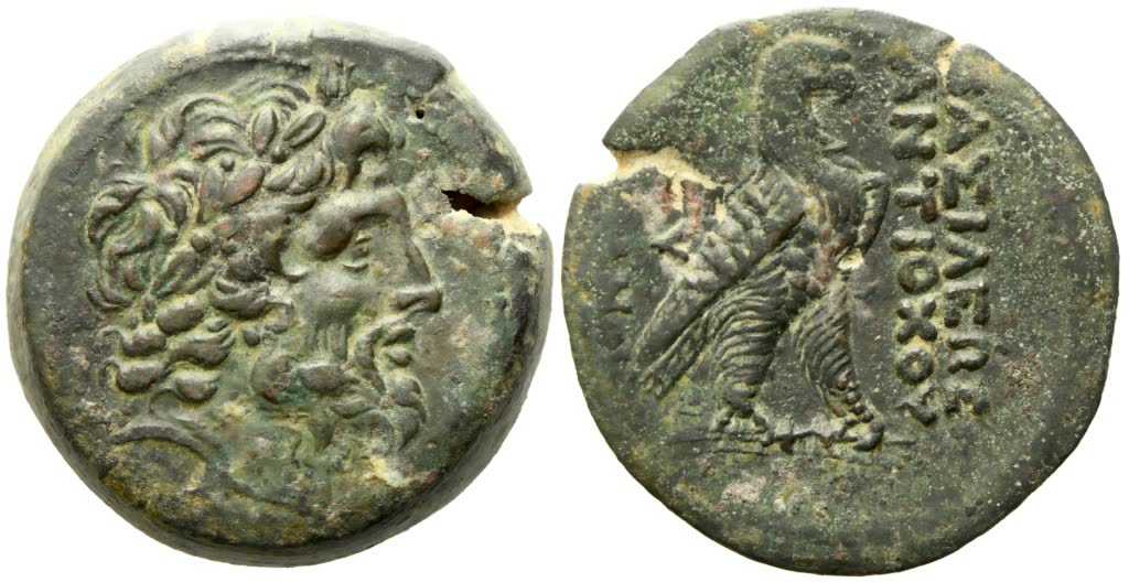 Laureate head of Zeus r.; Rv.: ΒΑΣΙΛΕΩΣ / ΑΝΤΙΟΧΟΥ / [ΘΕΟ]Υ / [ΕΠΙΦ]ΑΝΟΥ, eagle standing to right on thunderbolt. SC 1413; Newell, SMA 59; SNG Spaer 979. Brownish green patina. Crack at 2 o'clock on the obverse, otherwise extremely fine.