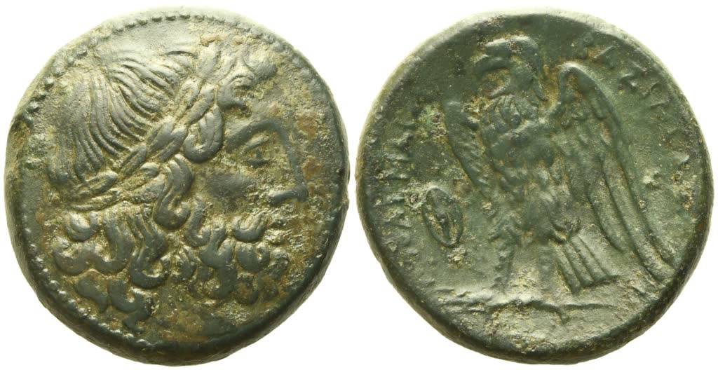Uncertain mint in Sicily. Struck circa 265/4 BC. Laureate head of Zeus to right, Rv. ΠΤΟΛΕΜΑΙΟΥ ΒΑΣΙΛΕΩΣ, eagle standing to left on thunderbolt, with wings spread; Galatian shield to left. CPE B289; Svoronos 610; Wolf & Lorber, 'Alexandrian' Style, P57–71; SNG Copenhagen 114. Green patina. Good extremely fine. Untouched.