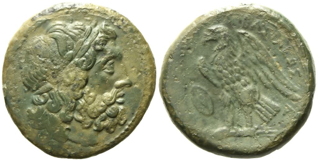 Uncertain mint in Sicily; struck c.ca 264–263 BC. Laureate head of Zeus r.; dotted border; Rv. [ΠTOΛEMAIOY] BAΣIΛEΩΣ, eagle standing l. on thunderbolt; shield to left, A to lower right; linear border. CPE B297; Svoronos 615; Wolf & Lorber, 'West Greek' Style, H37–H41. Green patina. Near extremely fine.