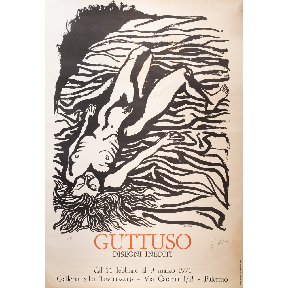 Manifesto litografico della mostra "Guttuso" disegni inediti, galleria La Tavolozza Palermo - 1971, es. 65/200