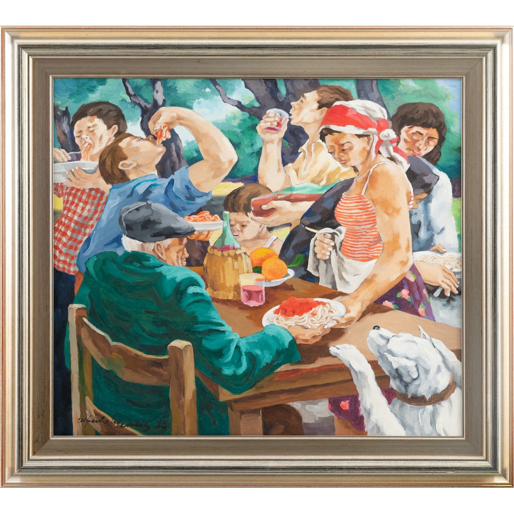 ALFREDO MESCHIS, Cena all'aperto, Olio su tela
