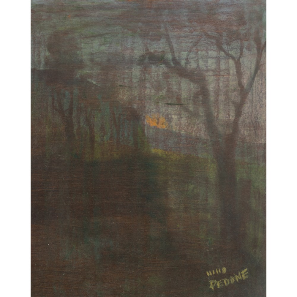 NINO PEDONE, Alberi e tramonto, Olio su faesite