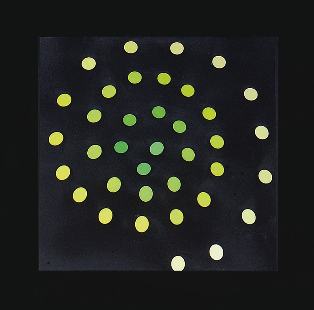 gradienti di luminosità, cilindretti plastici su faesite cm. 32x32, firma, titolo, anno e timbro dell'artista al retro, dichiarazione d'autenticità dell'artista su foto.