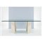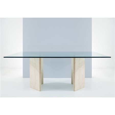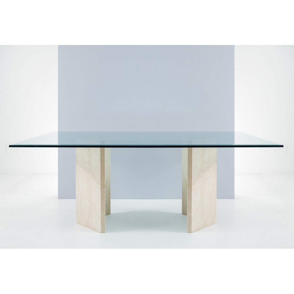 Tavolo da pranzo con piede in marmo botticino composto da due lastre di grosso spessore piegate a novanta gradi, piano rettangolare in cristallo incolore bisellato e molato.