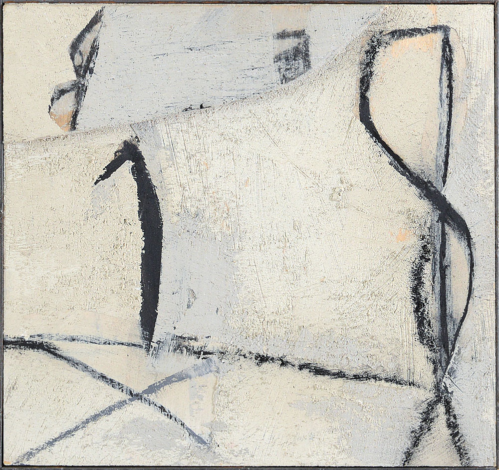 tecnica mista, sabbia e applicazioni su tavola cm. 40x43, firma, titolo, anno n° di cat. 1030 al retro, dichiarazione d'autenticità dell'artista su foto.